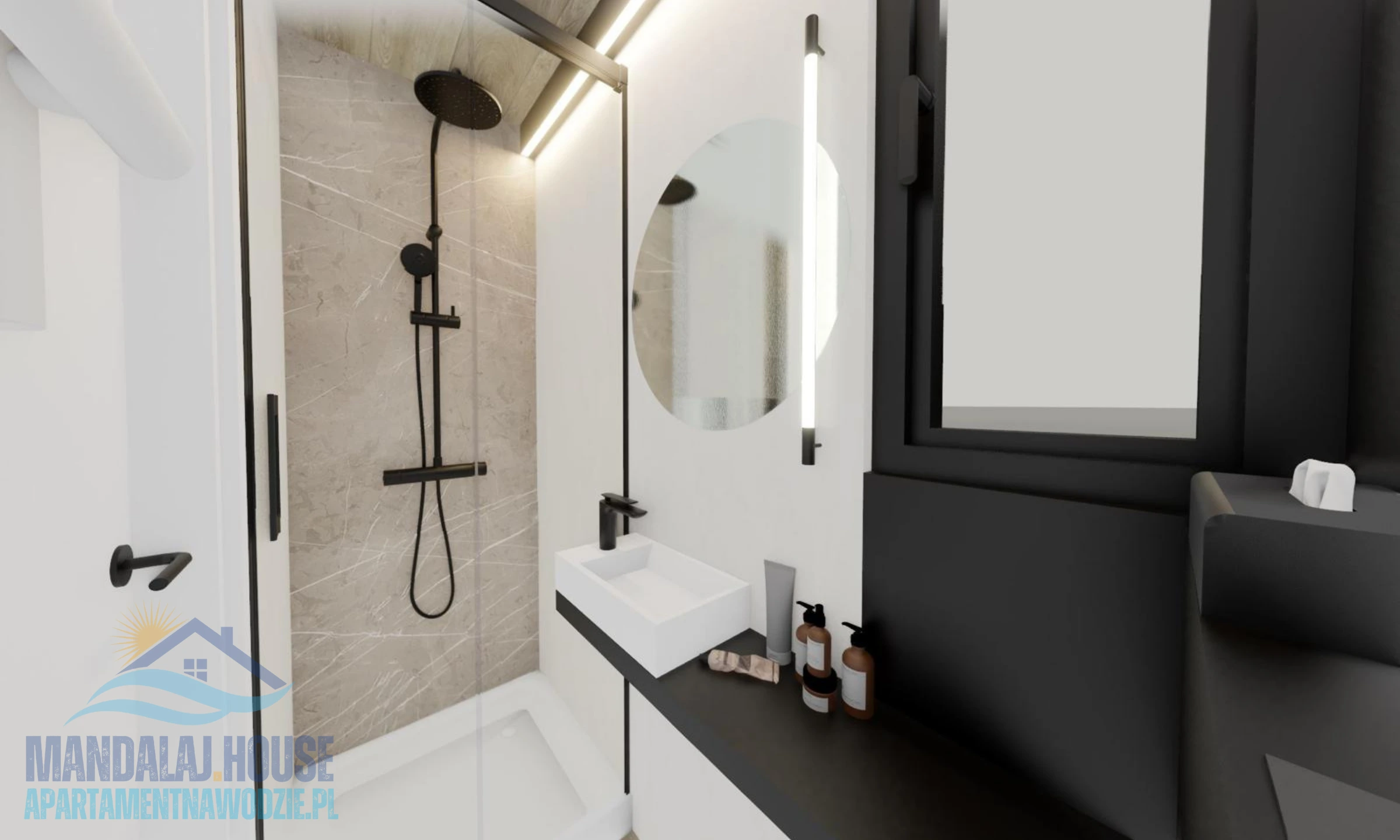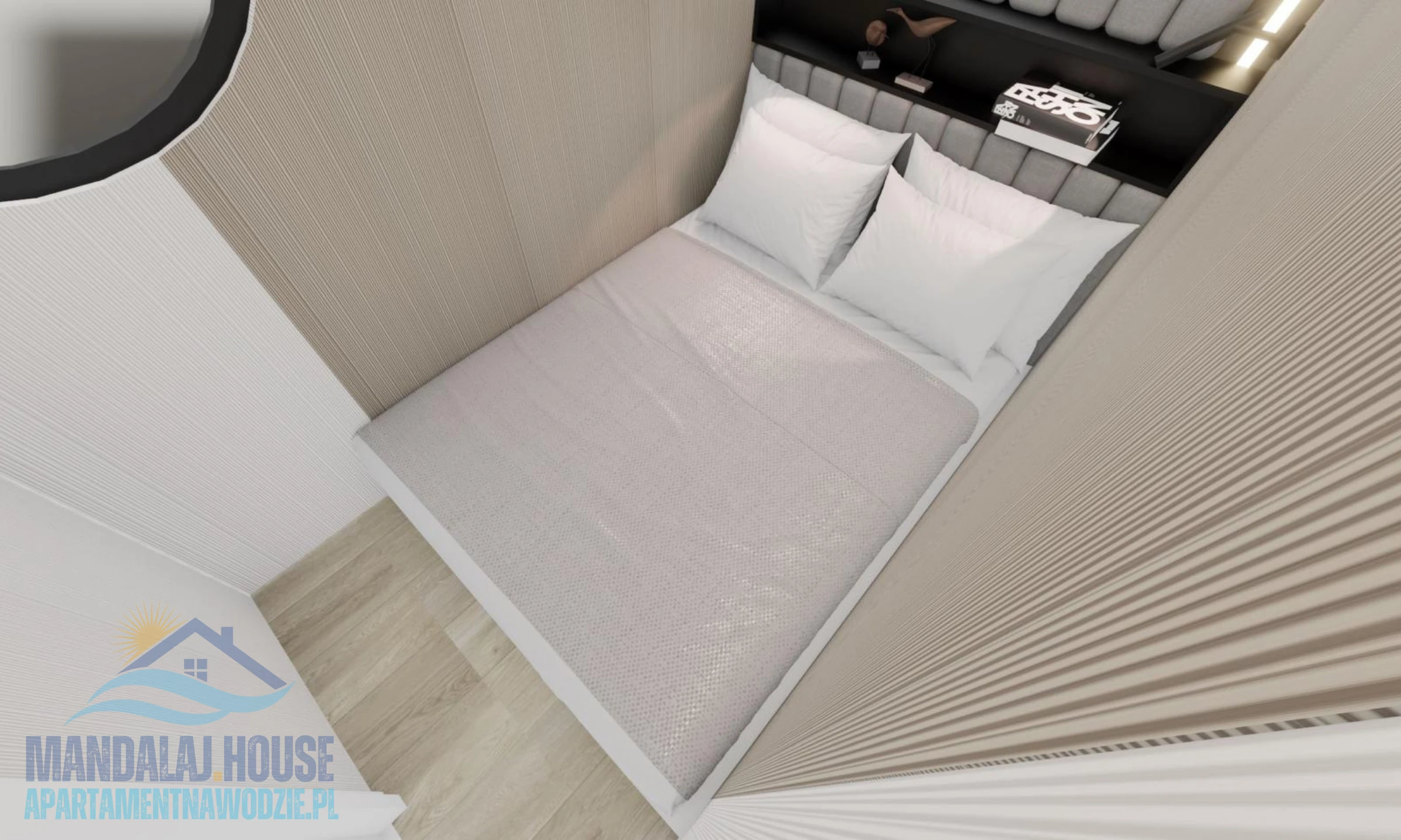 Apartament na Wodzie Mandalaj.House przystosowany jest również do potrzeb osób z niepełnosprawnościami. Drzwi wejściowe oraz drzwi do głównej sypialni i łazienki są specjalnie powiększone, na podłogach zamontowaliśmy specjalne, matowe panele zmniejszające ryzyko poślizgu, a w łazience dodatkowo zamontowany został system umożliwiający przywołanie opiekuna w sytuacji awaryjnej.